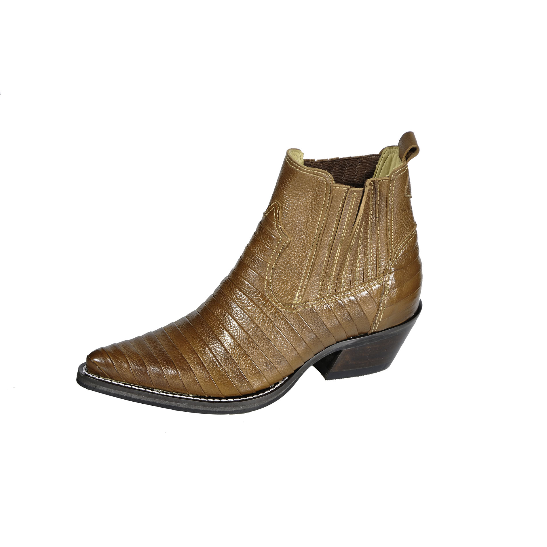 Botinas country de bico fino,trabalhada em couro bovino,montada em formato casco de tatu.Solado sintético extremamente resistente.Fino acabamento.