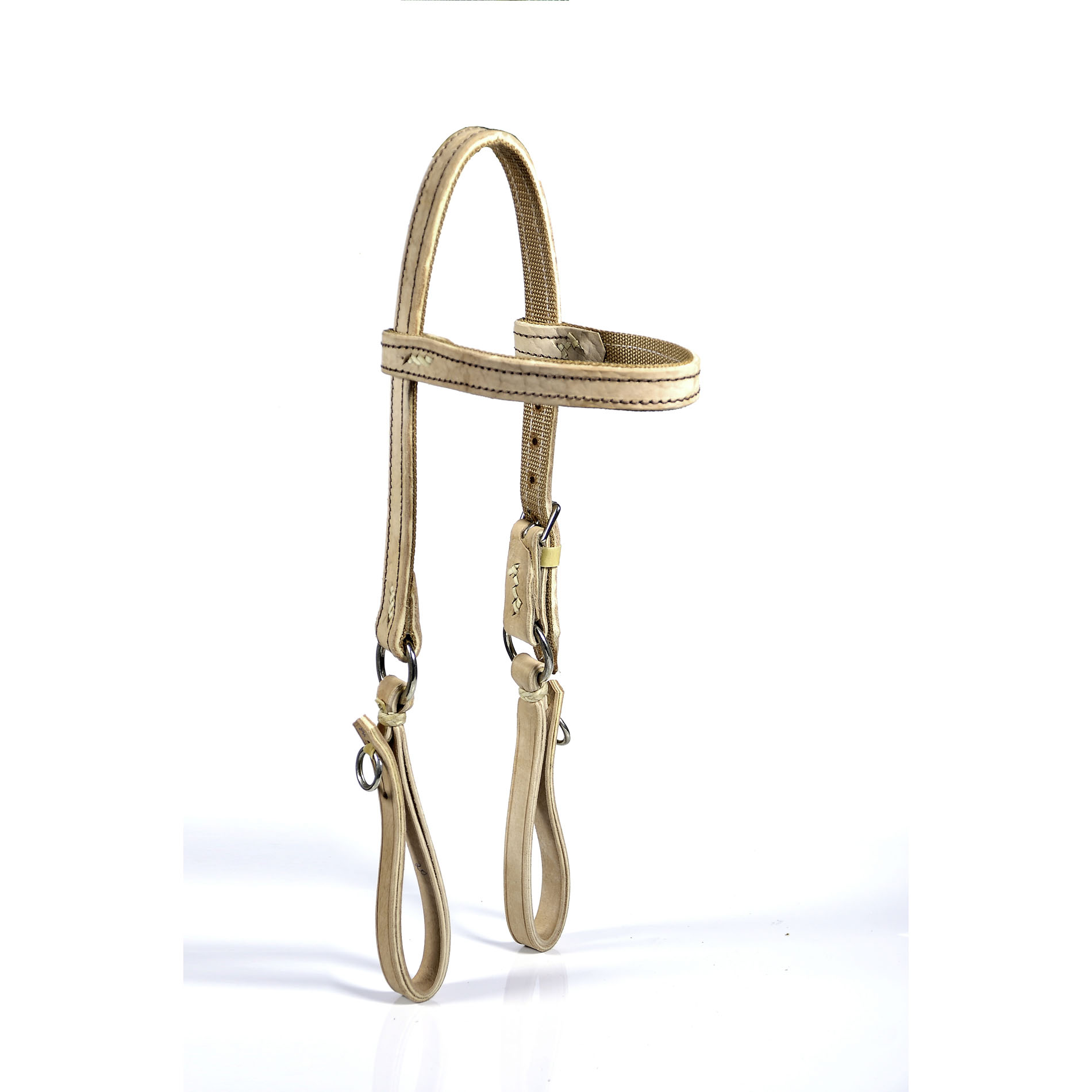 Cabeçada lisa,duplada,em couro meio-curtume costurado a uma fita de PP. Possui 2 argolas e uma fivela para ajuste, todas em metal.Ideal para trabalho diário,muito resistente.