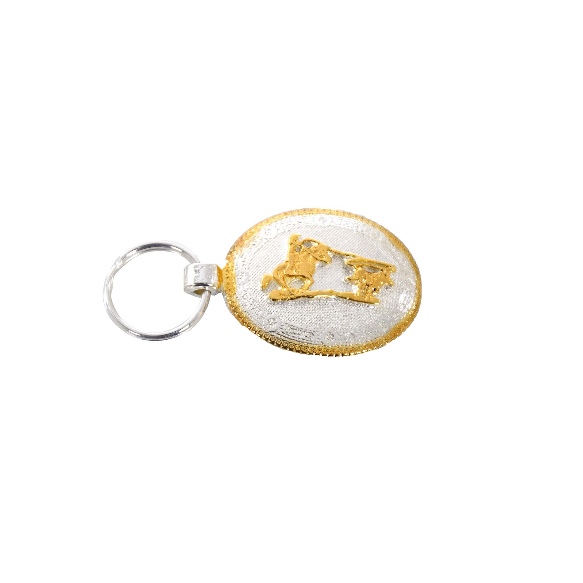 Chaveiro metálico,em banho prateado,oval,tipo fivela.Modelo Team Roping.