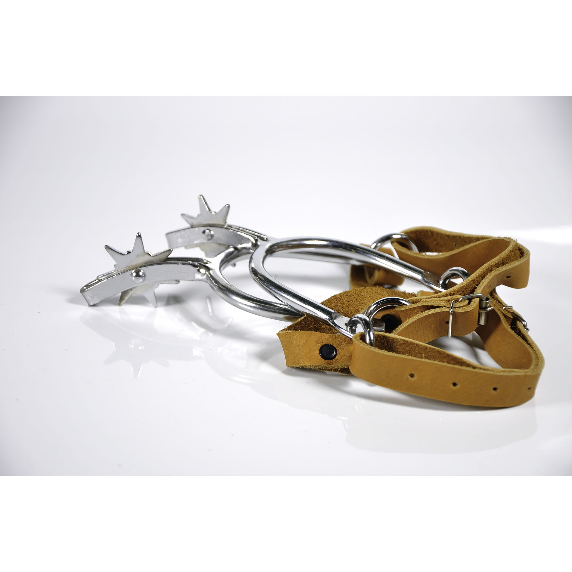 Espora modelo "buriti" de 7 bicos,em aço carbono,cromada.Com protetor de roseta,já com correias de vaqueta abufalada.