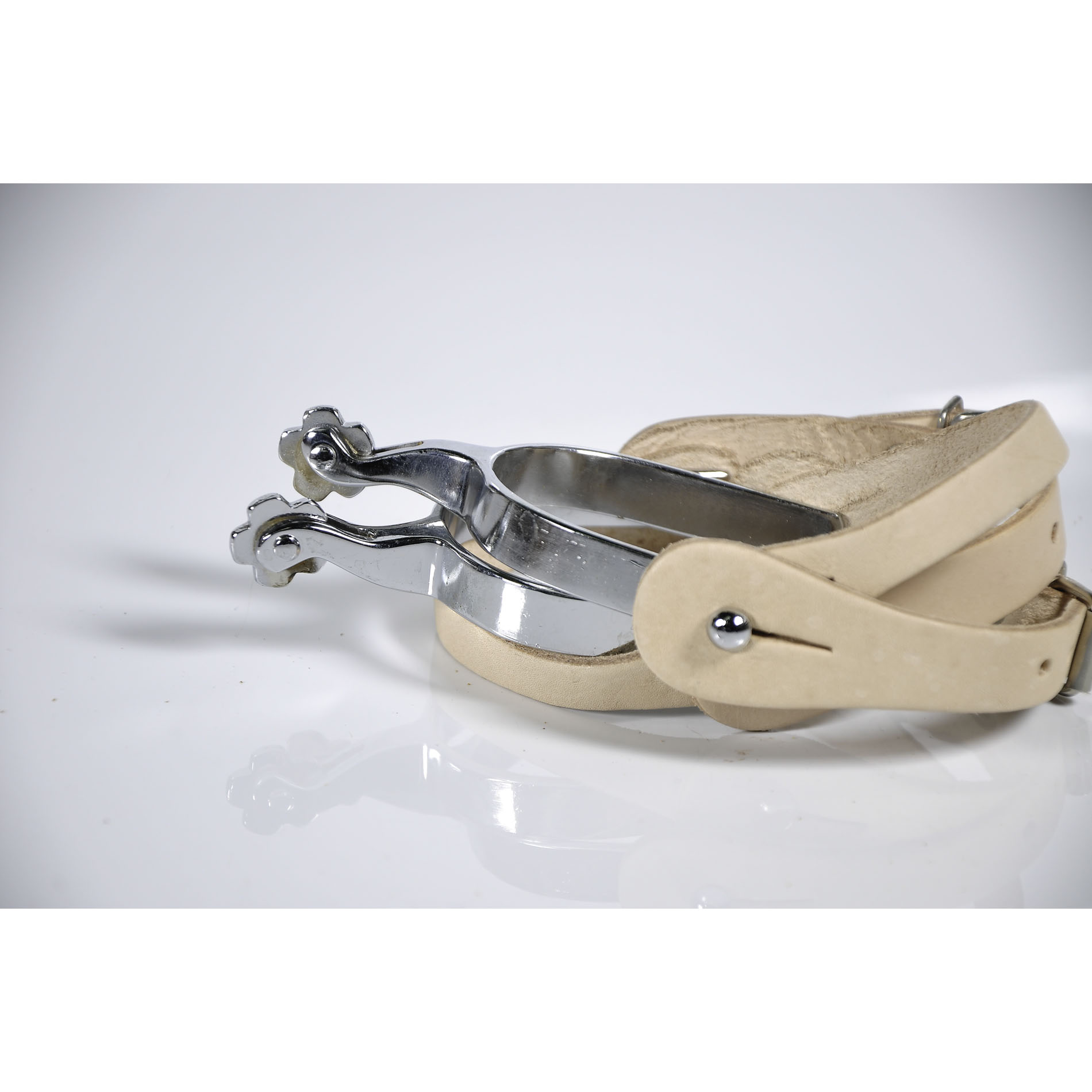 Espora infantil,modelo quarto de milha.Confeccionada em aço carbono cromado,acompanha correias de sola.Para crianças de 3 a 6 anos.