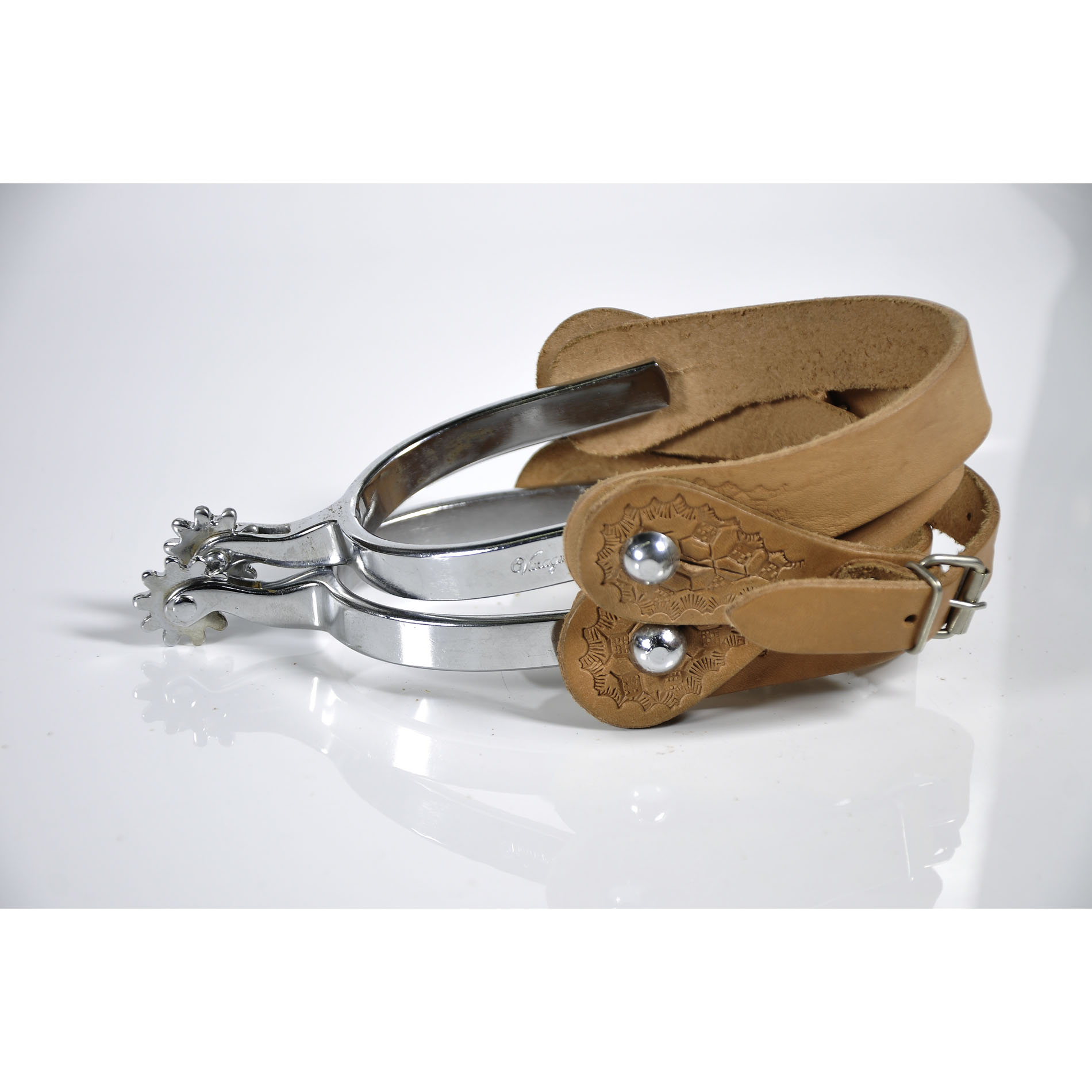 Espora infanto/juvenil,modelo quarto de milha.Confeccionada em aço carbono cromado,acompanha correias de sola.Para crianças de 3 a 6 anos.