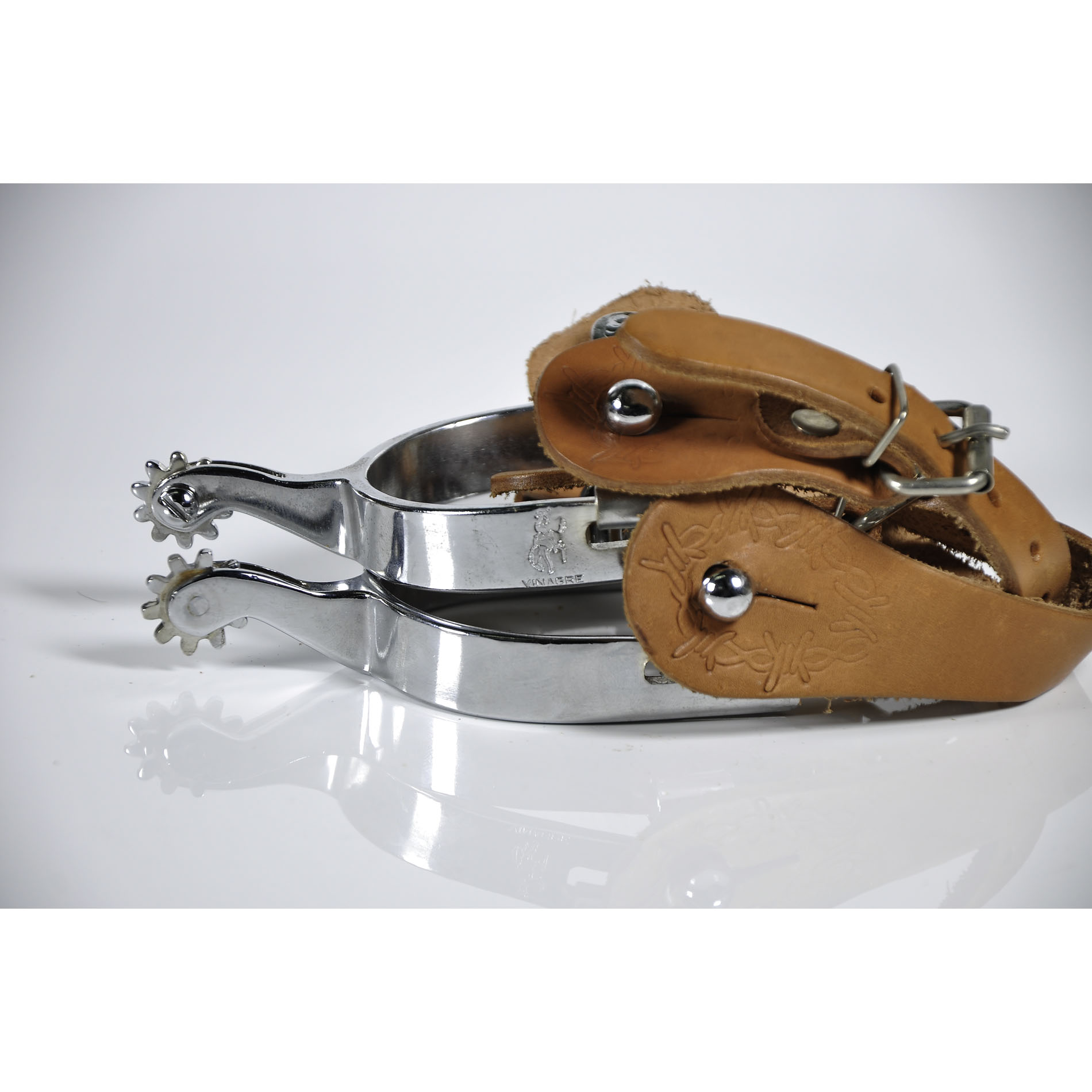 Esporas modelo quarto de milha,com rosetas médias,ideal para doma.Produto em aço carbono cromado,já com correias em sola.Para adultos.
