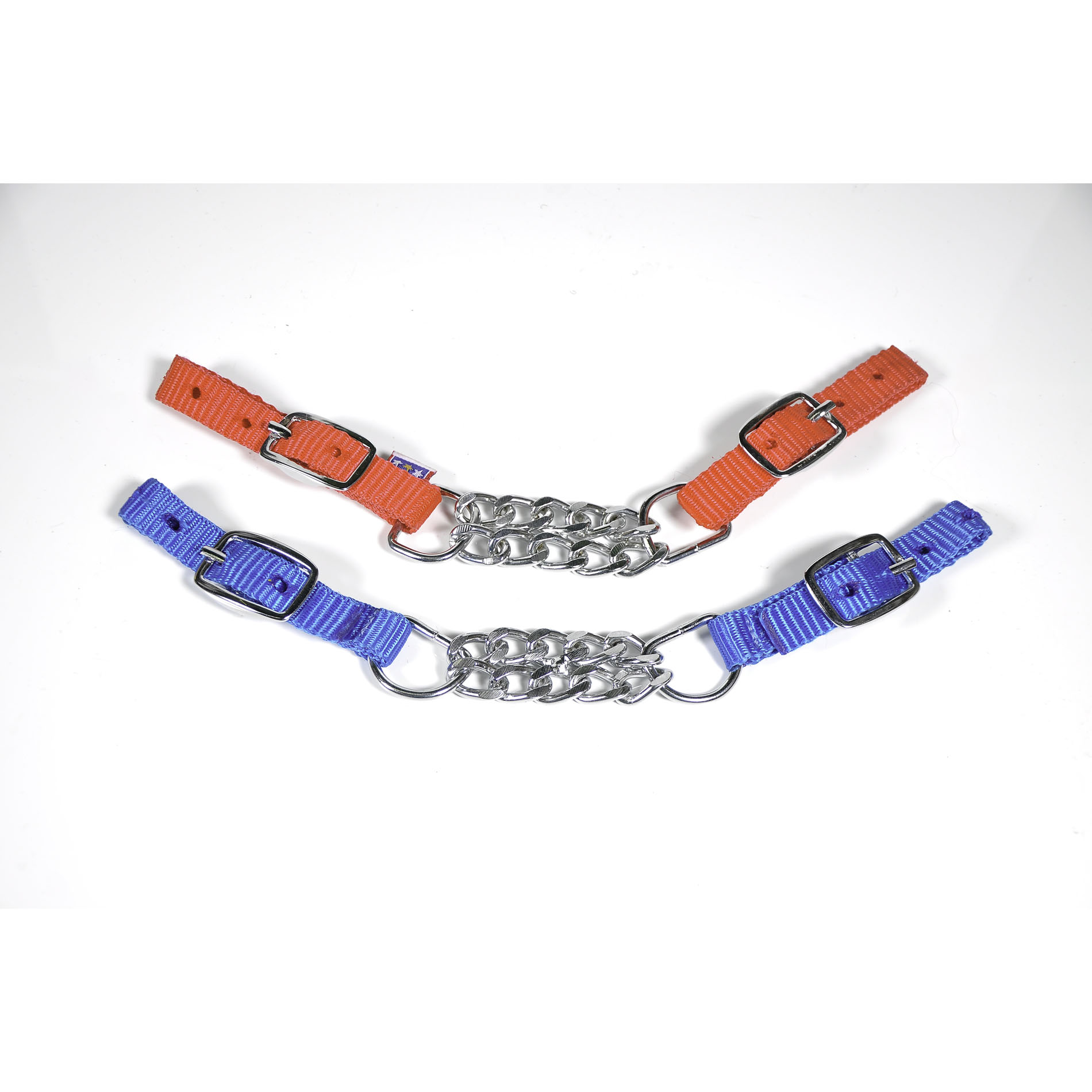 Confeccionada em fitas de polipropileno (pp), com duas correntes torcidas cromadas, com duas fivelas de regulagem de tamanho .