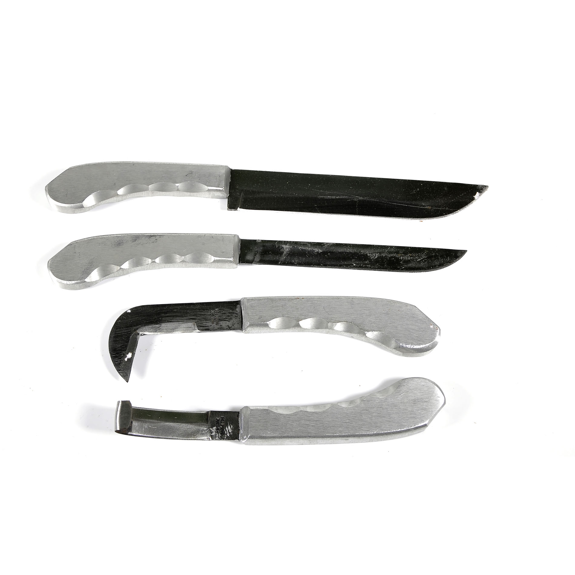 Jogo de 4 facas de aço carbono,com cabo fundido em alumínio.Composto de um rinete duplo(esquerdo e direito),uma faca foice para limpeza entre os cascos e duas facas retas para corte e desbaste.