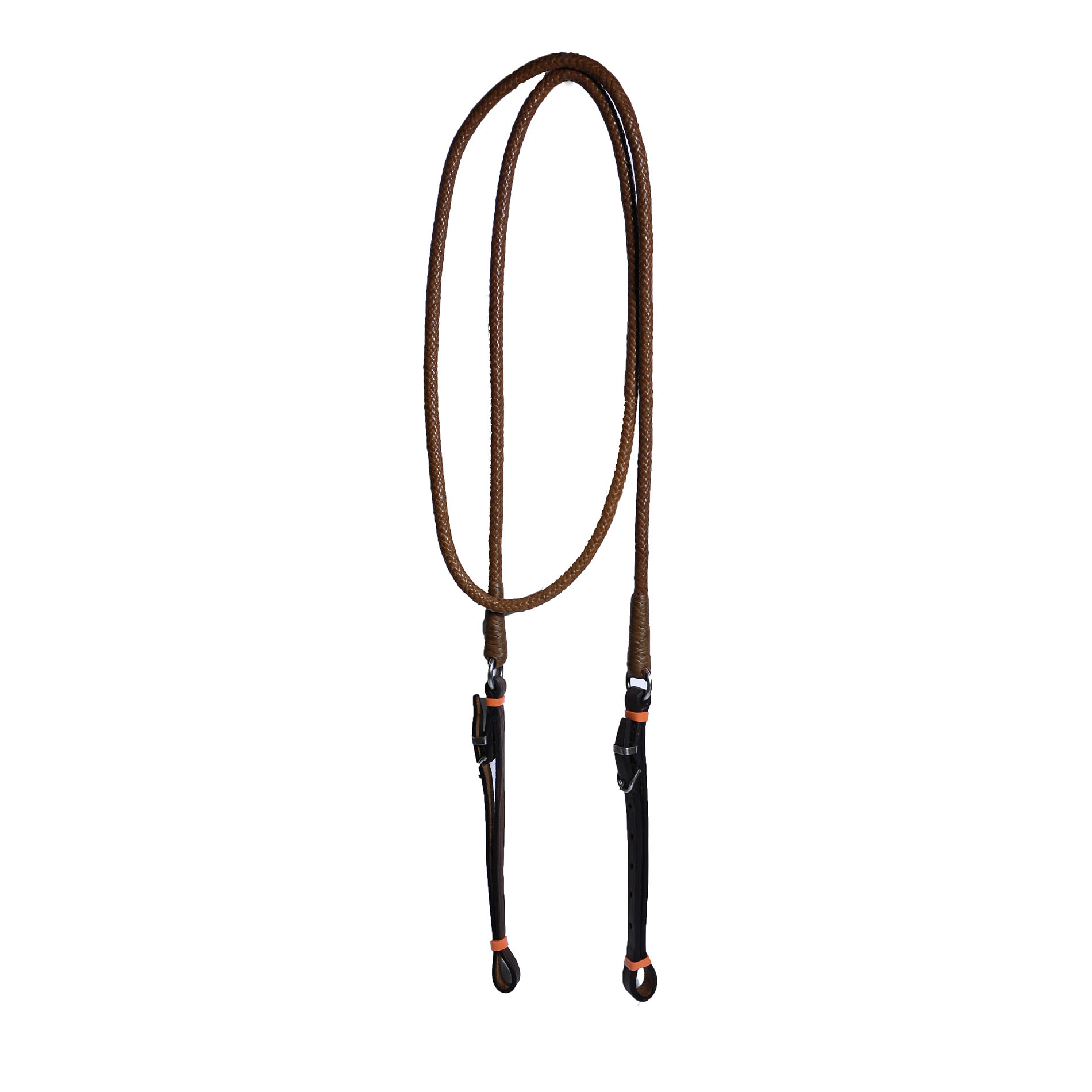 Rédea fechada ,trançada manualmente em couro de bode,com ferragens em aço inox.Muito leve e de ótima pega.