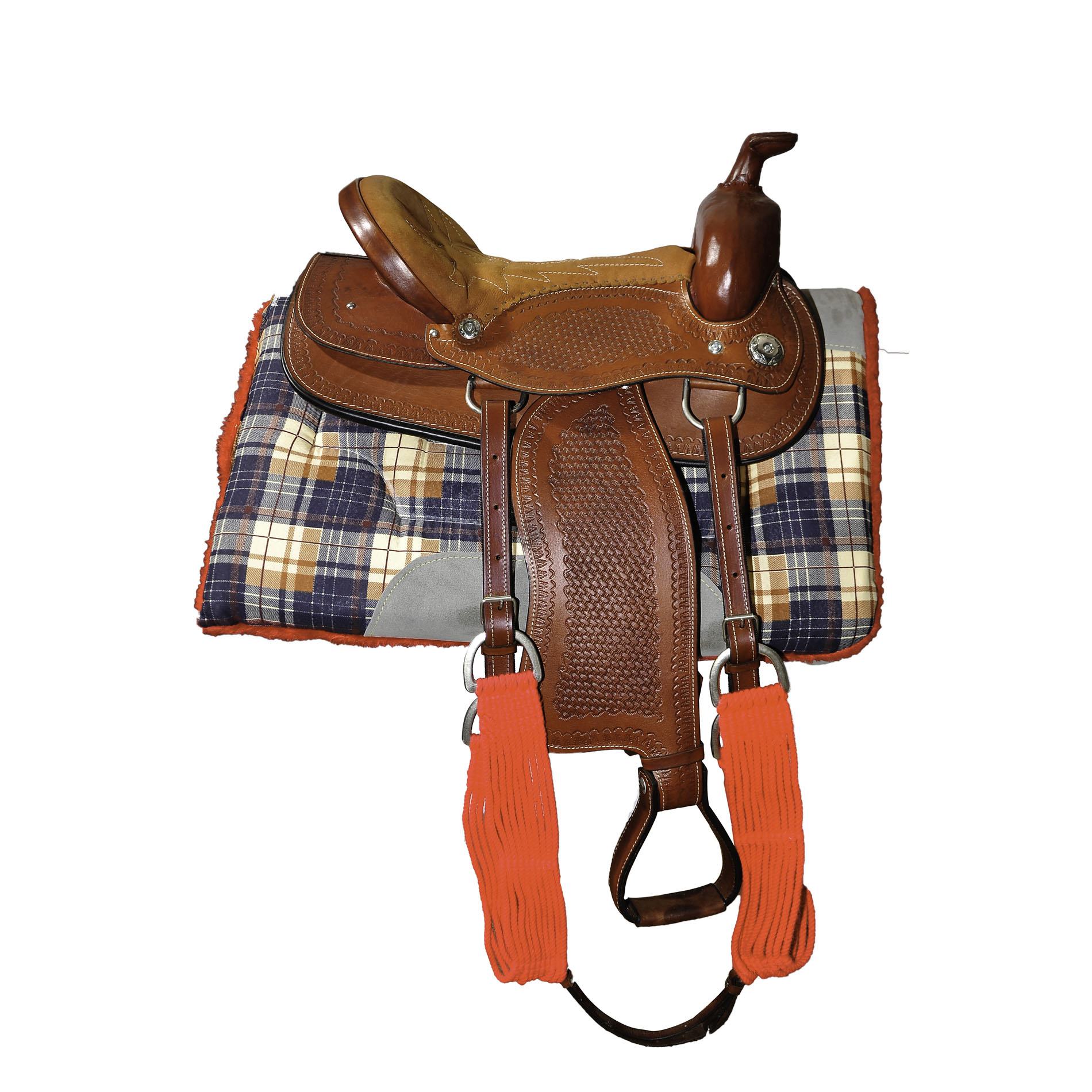 Sela modelo estilizada quarto de milha.Serve para qualquer animal,pois é muito leve e de tamanho menor do que as selas de prova.Completamente pronta para uso,incluindo manta e freio.