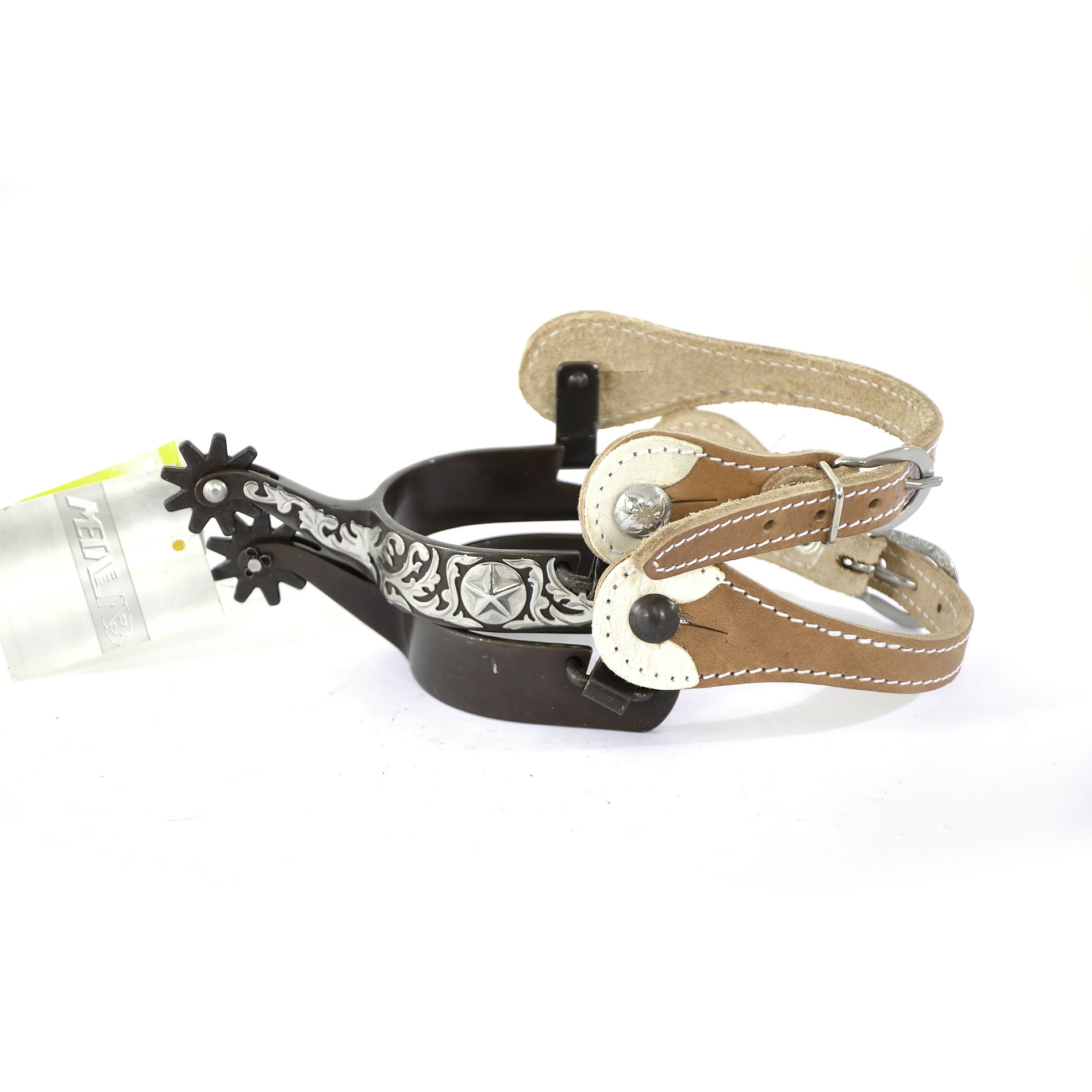 Espora quarto de milha em aço anodizado preto,importada.Com lateral larga,com detalhes rebitados cromados.Já com correias Paul Western reforçadas.